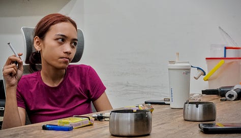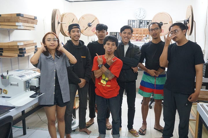 我就這樣在工場住了兩個星期。每天坐Grab落市中心上四小時印尼話課,觀察著工場運作,晚上跟他們夜話,學習印尼的有的沒的(當然是用英語為主。)。哪天有兩個成員不在,原來他們去了萬隆南部的成衣工廠搞工人培訓。一次回到工場,發覺音樂沒在播,原來Rizal正在跟NGO項目資助方的歐洲人開視像會議。又有一個周末,城中一個屬會的理事帶著幾支Chiu(一種道地傳統蒸溜酒)上來,跟他們共議大事。那種帶著荒謬的和諧感,歷歷在目。