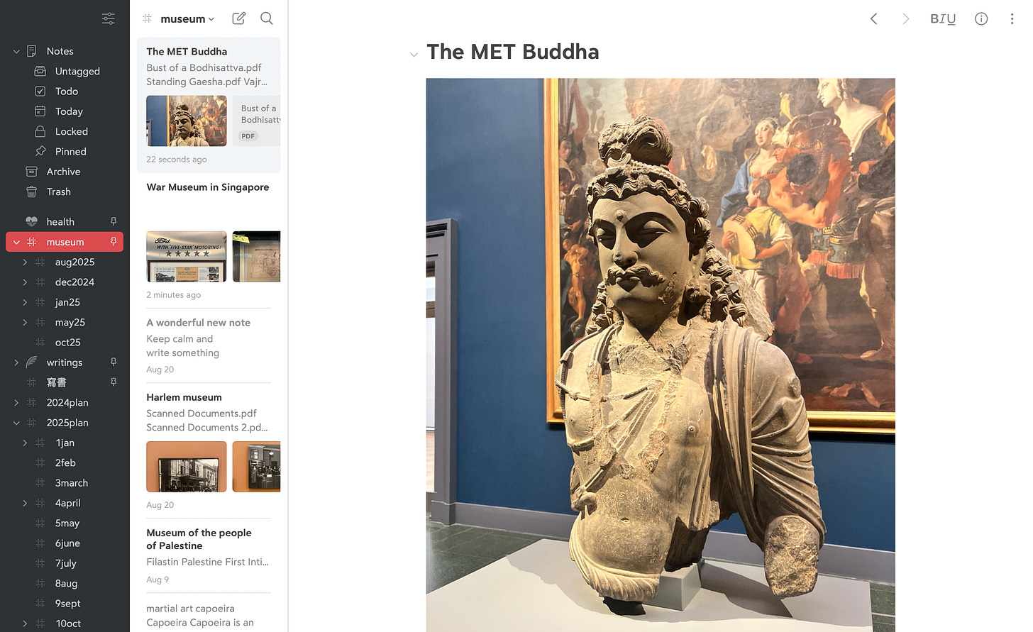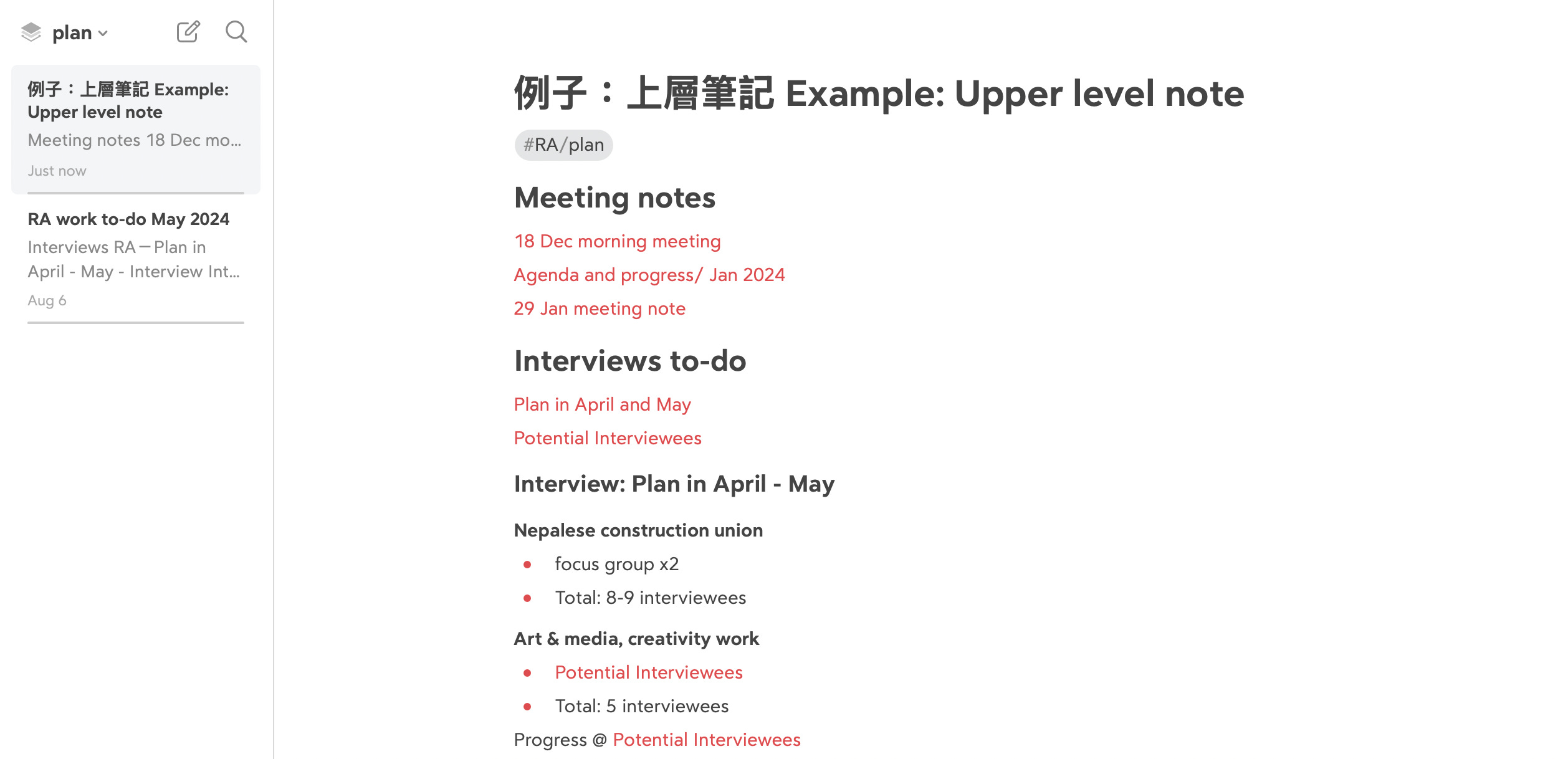 Bear的介面跟Apple Note相似,只是左邊第一欄的分類只有nested tags,而不是資料夾。左首第二欄是tags的搜尋結果,而右邊便是筆記的主體。當一個tag被打開,建立新檔案時便會自動列入該tag,無須重新輸入。第一欄左上角列於tags上方的幾個工具,是令我尚未完全脫離Bear的功能--那就是Untagged, Todo, Today 和Pinned。