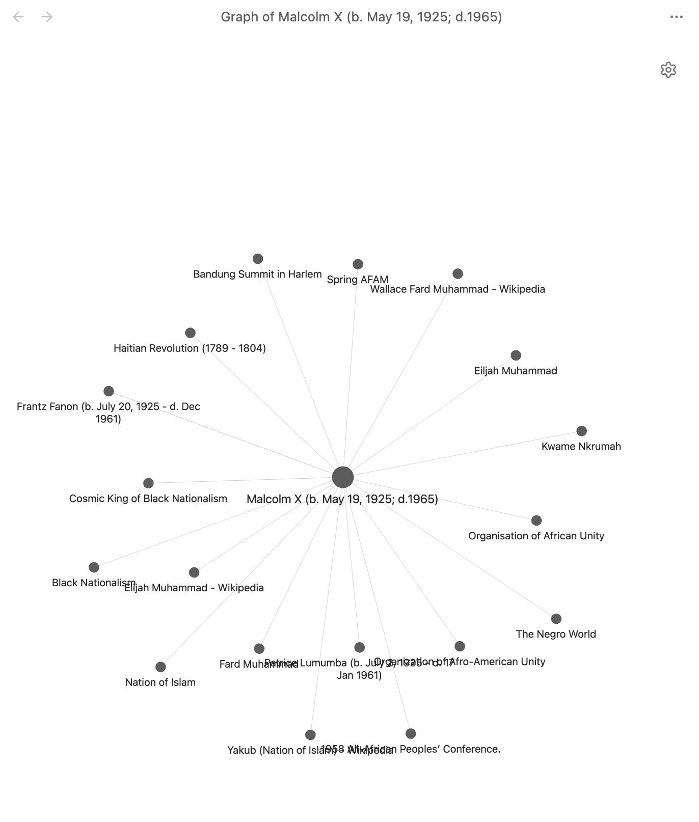 下圖顯示出我的筆記當中,Malcolm X這個人物與什麼概念、人物、事件相關,這些相關的概念之所以相連,是因為我在別的地方讀到Malcolm X,或者在讀Malcolm X時讀到其他概念。圖中每一點都代表著一份該概念的筆記--當然,每個檔案的內容是參差的,有時只有一句句子,或者一個定義,而不是詳盡的介紹。如是者,在寫作時一旦要回顧筆記,這些Blacklinks就提供了回顧的線索。